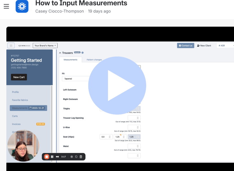This is the area where you will enter measurements for each ordered item. Select a fit or try-on size (if you're using Bespoke or Try-ons) to start adding numbers. Depending on the measurement method, you will see different editable boxes that appear.